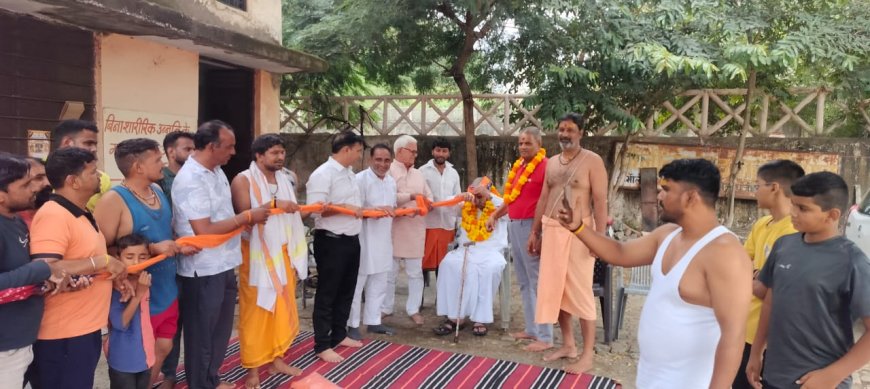तत्पश्चात व्यायाम शाला में सस्त्र पूजन का कार्यक्रम विधि विधान पूर्वक संपन्न हुआ उसके बाद व्यायाम शाला के उस्ताद लादू लाल चौबे का साफा पहनाकर स्वागत किया गया।